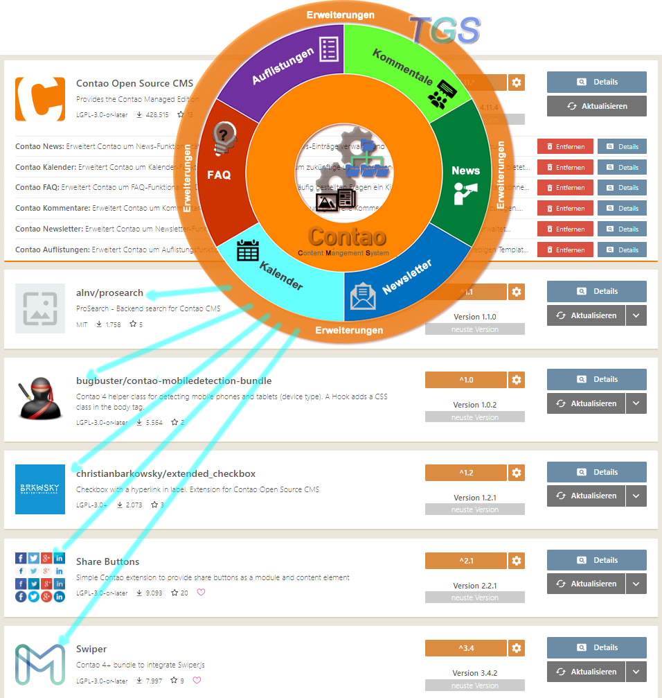 Für Contao existieren zusätzlich ca. 1450 Addon-Module/Erweiterungen